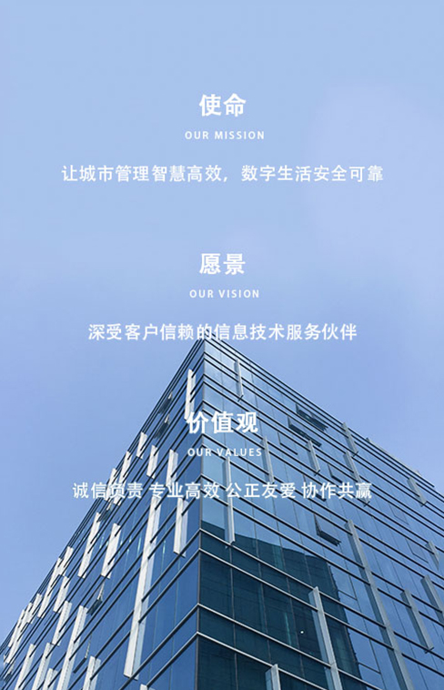 公司將“技術和服務創新”定位為“引領發展的第一動力”,以做“技術領先型”為目標,關愛員工成長,把個人和企業互相成就作為企業發展的原動力,樹立“誠信、責任、高效、專業”的企業核心價值觀,立足現在,放眼未來,立志成為中國信息技術和軟件服務行業優秀的高新技術企業。